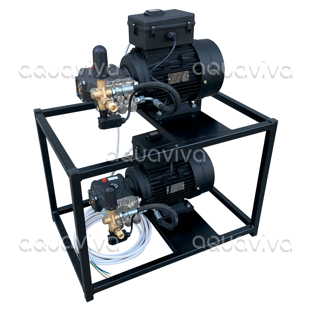 Установка используется для мойки корпусов пищевых предприятий (например, корпуса выращивания птицы), мойки сельхозтехники, в перерабатывающей промышленности, для промывки канализации, в химической и нефтегазовой отрасли, на автомоечных комплексах для мойки грузового транспорта и т.д. Комплектация: - Рама стальная двухуровневая - Моноблок мотор-помпа серии HPS с электронным блоком управления с влагозащитным выключателем – 2 шт. - Регулятор давления с системой By-Pass без датчика «Total-stop» - 2шт. - Электрический кабель подключения 4м Дополнительные опции: - Регулятор давления с системой By-Pass с датчиком «Total-stop» -Рукав высокого давления 2SN8 10, 15, 20, 25 м, с фитингами - Пистолет со струйной трубкой и форсункой (300-1500мм) - Манометр - Входной фильтр тонкой очистки