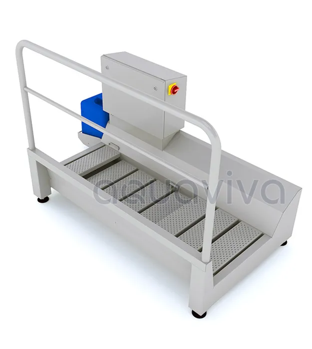 В момент подъема персонала на платформу санпропускника пересекается луч датчика, который учитывает количество персонала прошедшего через него. Персонал проходит через ванну, наполненную дезраствором. После прохода каждых 25 человек раствор в ванной автоматически обновляется. Излишний раствор сливается в поддон и канализационную систему. Подготовка химического раствора происходит в автоматическом режиме. Концентрация раствора регулируется. Быстрый демонтаж и монтаж настилов без использования инструмента позволяет оперативно производить мойку и чистку санпропускника. Наличие регулируемых опорных ножек позволяют выставить санпропускник по уровню. В санпропускнике имеется место для расположения 20-литровой канистры с дезинфектантом. Также имеется индикатор уровня реагента. Возможно подключение к централизованной подаче химических реагентов! Возможно как левое, так и правое исполнение. Санпропускник серии DZD устанавливаются на пол. Также возможно заказать дополнительные заграждения и поручни, выполненные из нер
