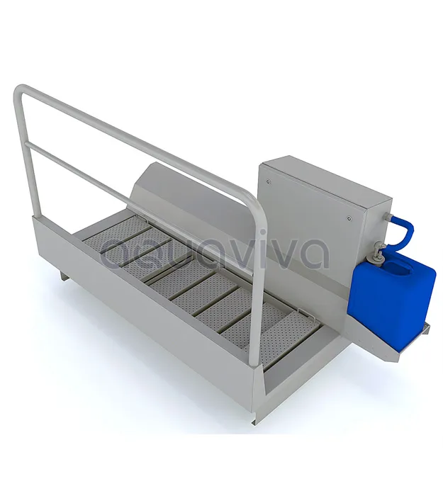 В момент подъема персонала на платформу санпропускника пересекается луч датчика, который учитывает количество персонала прошедшего через него. Персонал проходит через ванну, наполненную дезраствором. После прохода каждых 25 человек раствор в ванной автоматически обновляется. Излишний раствор сливается в поддон и канализационную систему. Подготовка химического раствора происходит в автоматическом режиме. Концентрация раствора регулируется. Быстрый демонтаж и монтаж настилов без использования инструмента позволяет оперативно производить мойку и чистку санпропускника. Наличие регулируемых опорных ножек позволяют выставить санпропускник по уровню. В санпропускнике имеется место для расположения 20-литровой канистры с дезинфектантом. Также имеется индикатор уровня реагента. Возможно подключение к централизованной подаче химических реагентов! Возможно как левое, так и правое исполнение. Санпропускник серии DZD устанавливаются на пол. Также возможно заказать дополнительные заграждения и поручни, выполненные из нер