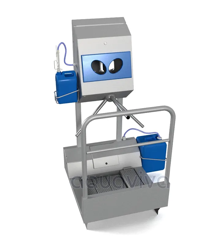 В момент подъема персонала на платформу санпропускника пересекается луч датчика, который учитывает количество персонала, прошедшего через него. Персонал проходит через ванну наполненную дезраствором. После прохода каждых 25 человек раствор в ванной автоматически обновляется. Излишний раствор сливается в поддон и канализационную систему. Подготовка химического раствора происходит в автоматическом режиме. Концентрация раствора регулируется. Быстрый демонтаж и монтаж настилов без использования инструмента позволяет оперативно производить мойку и чистку санпропускника. В санпропускнике имеется место для расположения 20-литровой канистры с дезинфектантом. После размещения обеих рук в овальные камеры, благодаря датчикам происходит автоматическое распыление дезинфектанта. Обращаем внимание, что в каждой камере расположено по две форсунки, сверху и снизу, что позволяет производить дезинфекцию более качественно и быстро. Также возможно регулировать время распыления дезинфектанта. После обработки рук турникет автомат