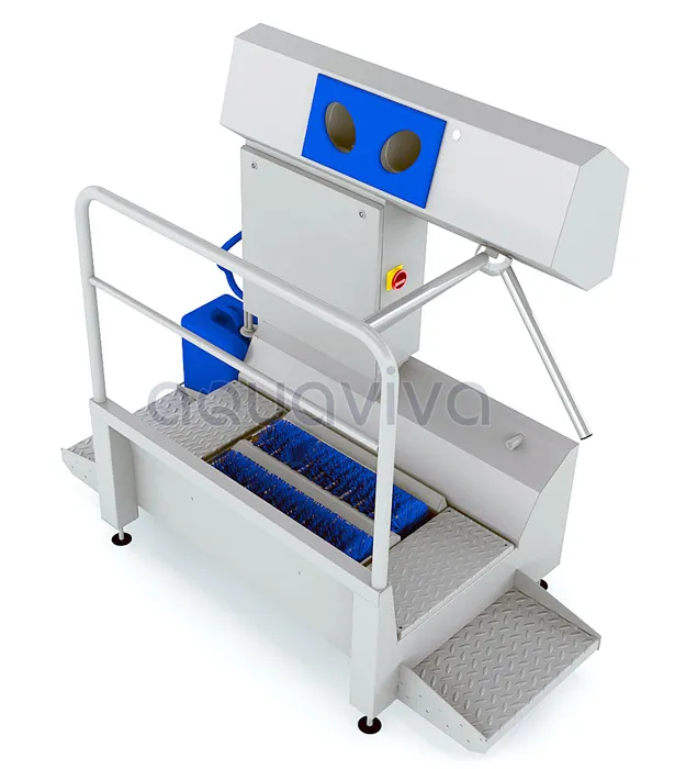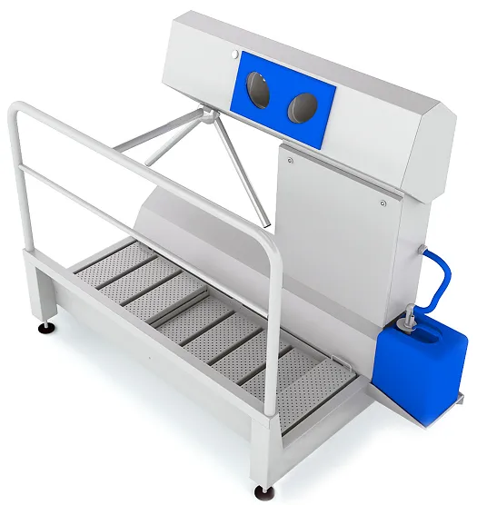 В момент подъема персонала на платформу санпропускника пересекается луч датчика, который включает вращение щеток и подачу дезраствора непосредственно на ворс щеток. Излишний раствор сливается в поддон и канализационную систему. Подготовка химического раствора происходит в автоматическом режиме. Концентрация раствора регулируется. Возможна регулировка времени вращения щеток. Быстрый демонтаж и монтаж щеток без использования инструмента позволяет оперативно производить мойку и чистку санпропускника. В санпропускнике имеется место для расположения 20-литровой канистры с дезинфектантом. После размещения обеих рук в овальные камеры, благодаря датчикам происходит автоматическое распыление дезинфектанта. Обращаем внимание, что в каждой камере расположено по две форсунки, сверху и снизу, что позволяет производить дезинфекцию более качественно и быстро. Также возможно регулировать время распыления дезинфектанта. После обработки рук турникет автоматически разблокируется, позволяя пройти персоналу в рабочую зону пре