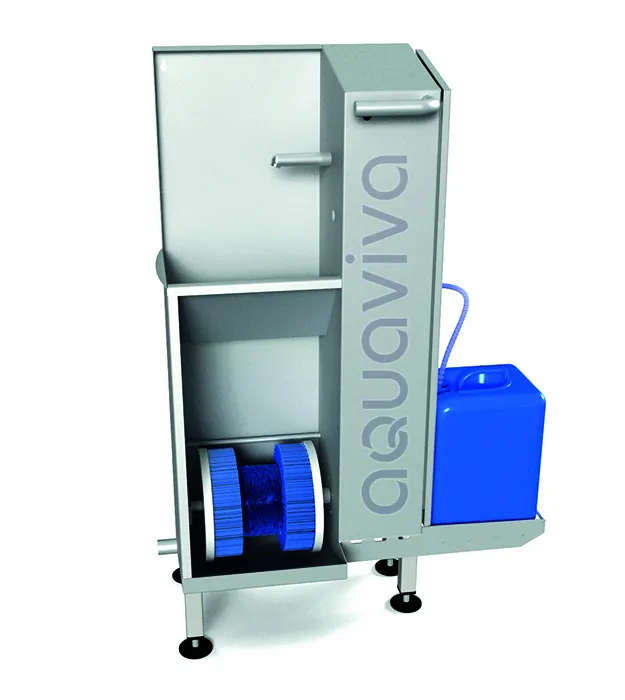 Отдельно стоящая установка для чистки и обработки дезраствором подошв и рантов сабо и сапог.