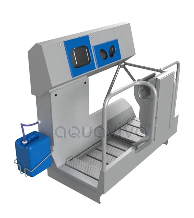 Эта модель встраивается в пол помещения, то есть верхняя часть и щетки санпропускника находятся на одном уровне с полом. Благодаря такому решению персоналу не требуется подниматься и спускаться по ступенькам санпропускника, что более безопасно и гигиенично. В момент подъема персонала на платформу санпропускника пересекается луч датчика, который учитывает количество персонала, прошедшего через него. Персонал проходит через ванну, наполненную дезраствором. После прохода каждых 25 человек раствор в ванной автоматически обновляется. Излишний раствор сливается в поддон и канализационную систему. Подготовка химического раствора происходит в автоматическом режиме. Концентрация раствора регулируется. Быстрый демонтаж и монтаж настилов без использования инструмента позволяет оперативно производить мойку и чистку санпропускника. В санпропускнике имеется место для расположения 20-литровой канистры с дезинфектантом. Также имеется индикатор уровня реагента. Возможно подключение к централизованной подаче химических реаге
