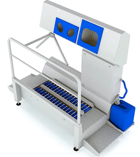В момент подъема персонала на платформу санпропускника пересекается луч датчика, который включает вращение щеток и подачу дезраствора непосредственно на ворс щеток. Излишний раствор сливается в поддон и канализационную систему. Подготовка химического раствора происходит в автоматическом режиме. Концентрация раствора регулируется. Возможна регулировка времени вращения щеток. Быстрый демонтаж и монтаж щеток без использования инструмента позволяет оперативно производить мойку и чистку санпропускника. Щетки выполнены из высококачественных материалов. Гарантия на щетки 2 года. Возможна расширенная гарантия до 4 лет! В санпропускнике имеется место для расположения 20-литровой канистры с дезинфектантом. Также имеется индикатор уровня реагента. Возможно подключение к централизованной подаче химических реагентов! В санпропускнике имеется встроенная раковина. Сенсорный датчик включает и выключает подачу воды. Благодаря термостатическому регулятору, который смонтирован внутри корпуса санпропускника, устанавливает