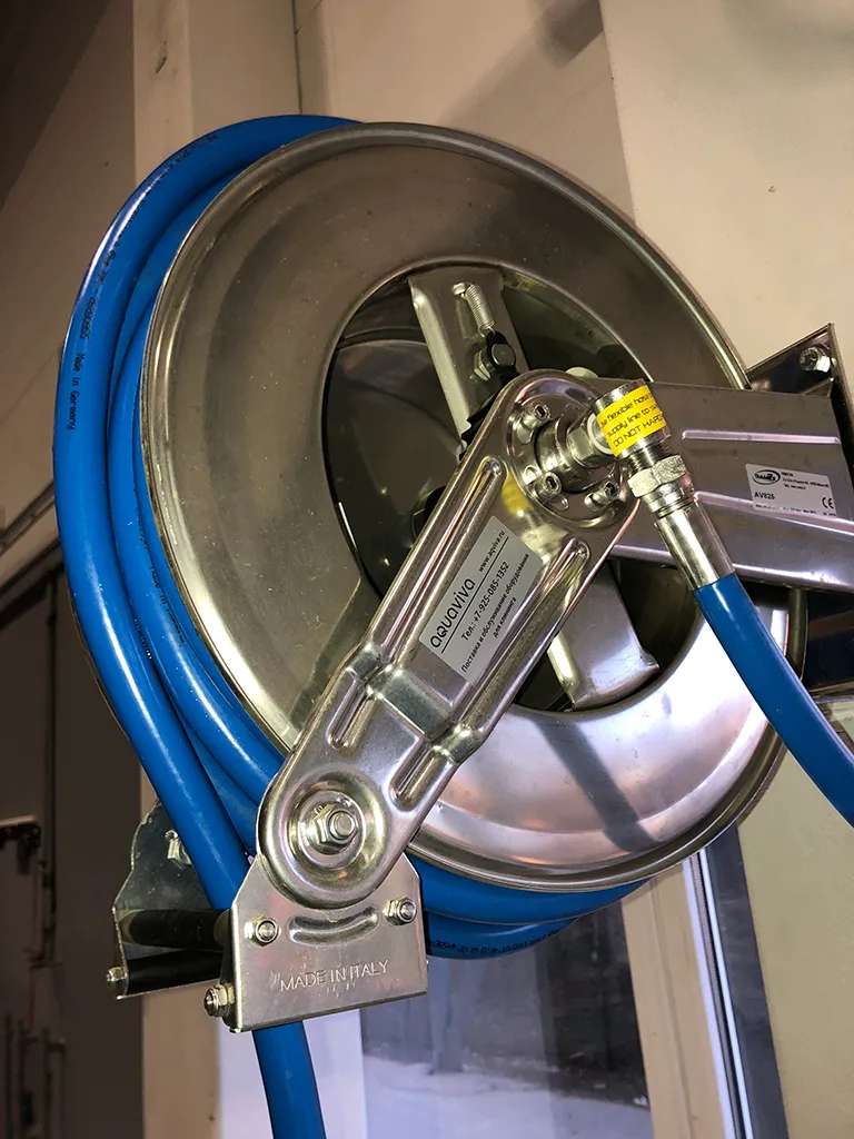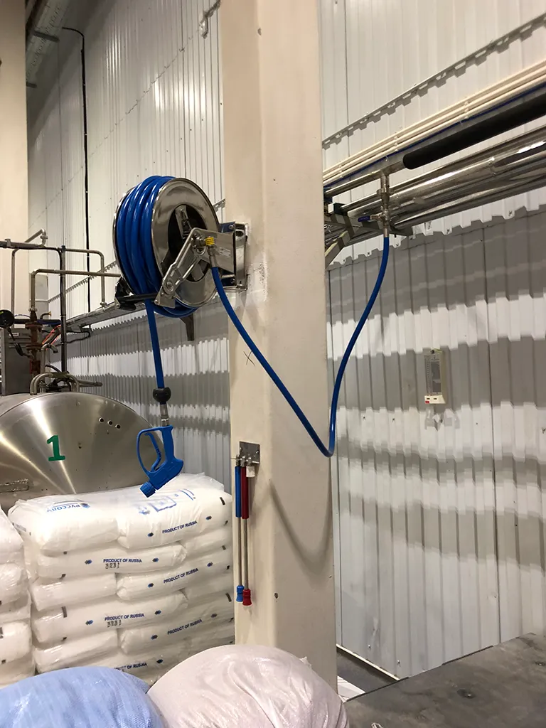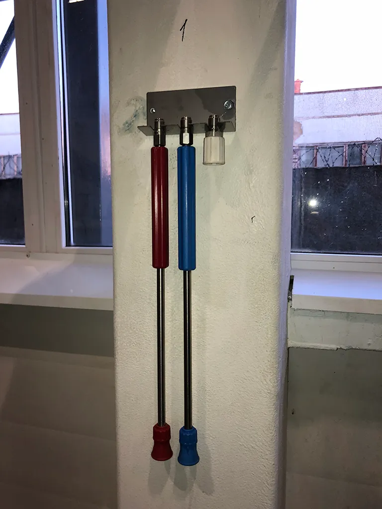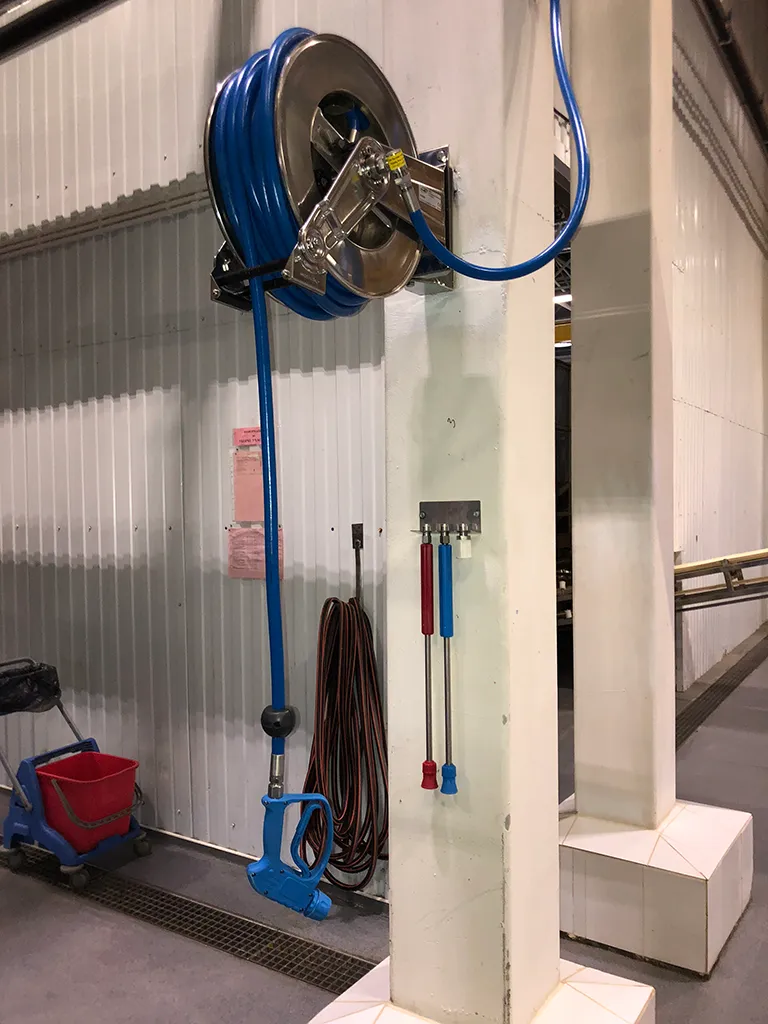 Посты пенной мойки высокого давления включают в себя: Инерционный барабан высокого давления 200 бар на 20 метров шланга, двухоплеточный шланг высокого давления 400 бар, пистолет высокого давления с БРС байонетом, комплект струйных трубок длинной 900 мм с БРС ниппелями серии KW - трубка для ополаскивания, пенная трубка с пенообразователем высокого давления, копье для дезинфекции. На стене установлен держатель струйных трубок и сдвоенный канистродержатель.